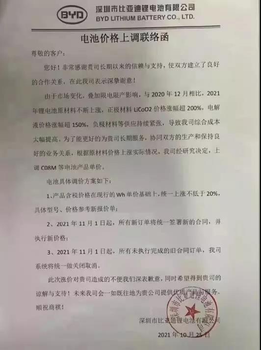 深圳市比亞迪鋰電池有限公司電池價格上調(diào)聯(lián)絡(luò)函尊敬的客戶:您好!非常感謝貴司長期以來的信賴與支持,使雙方建立了良好的合作關(guān)系,在此我司表示深摯謝意!由于市場變化,疊加限電限產(chǎn)影響,與2020年12月相比,2021年鋰電池原材料不斷上漲,正極材料LiCoO2價格漲幅超200%,電解液價格漲幅超150%,負極材料等供應(yīng)持續(xù)緊張,導(dǎo)致我司綜合成本大幅提高。為了能更好的為貴司長期服務(wù),協(xié)同雙方的生產(chǎn)和保持良好的業(yè)務(wù)關(guān)系,根據(jù)原材料價格上漲實際情況,我司經(jīng)研究決定,上調(diào)C08M等電池產(chǎn)品單價。電池具體調(diào)價方案如下:1、產(chǎn)品含稅價格在現(xiàn)行的Wh單價基礎(chǔ)上,統(tǒng)一上漲不低于20%,具體型號、價格參考新報價單:2、2021年11月1日起,所有新訂單將統(tǒng)一簽署新的合同,并執(zhí)行新價格;3、2021年11月1日起,所有未執(zhí)行完成的舊合同訂單,我司系統(tǒng)將統(tǒng)一做關(guān)閉取消。此次漲價對貴司造成的不便我們深表歉意,同時希望得到貴司的諒解與支持!未來我司會一如既往地為貴公司提供優(yōu)質(zhì)產(chǎn)品與服務(wù)。順祝商祺!深圳市比亞迪鋰電池有限公司2021年10月25日
