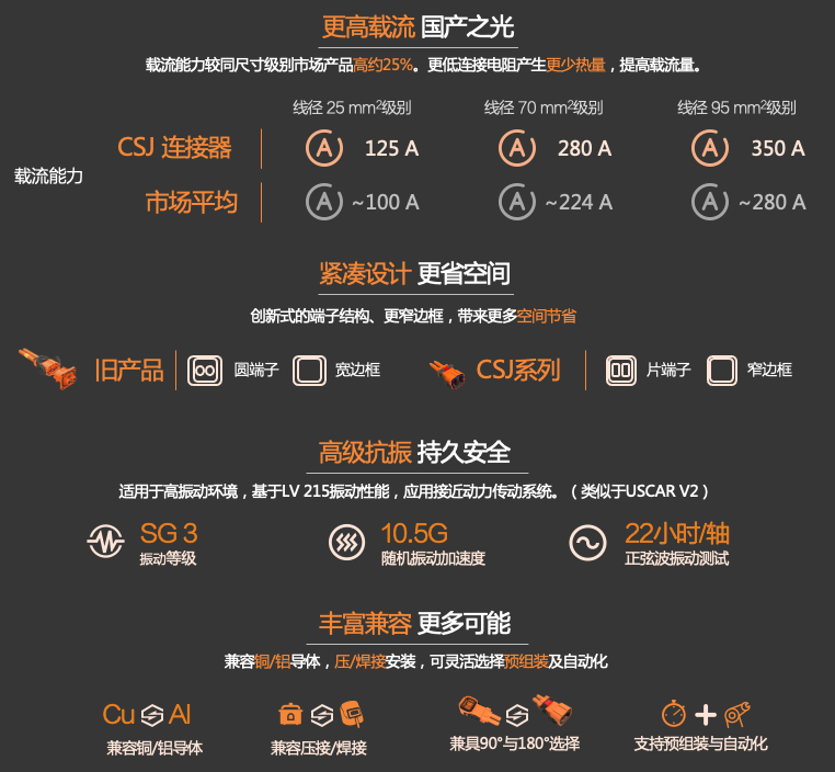 針對不同細(xì)分需求,CSJ系列分為CSJ1200、CSJ1800與CSJ2100三款高壓連接器,分別對應(yīng)Class3、Class4、Class5級別的載流級別需求。三款產(chǎn)品在不同應(yīng)用領(lǐng)域各擅勝場: